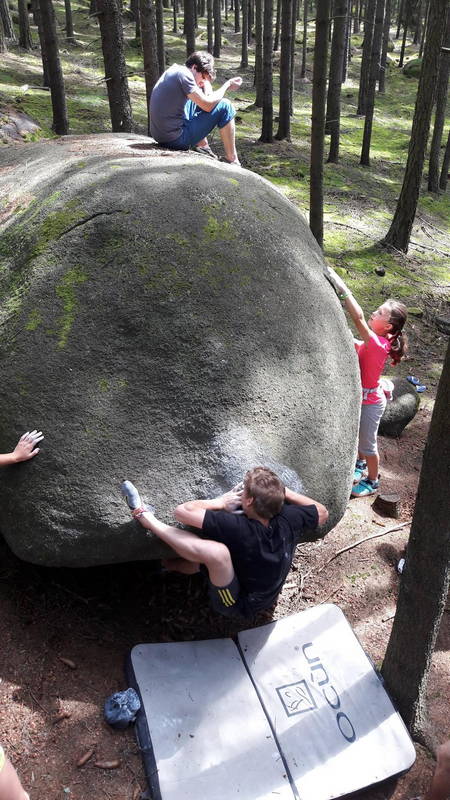 Sledila sta dva lepa dneva, ki smo jih seveda dodobra izkoristili za plezanje v sencah dreves. V lepem vremenu smo se napenjali v sektorju Brana in bili uspešni v balvanih do 7B+. Tretji dan smo našli zelo lepe balvane v gozdičku pod gradom. Spet sta po 7C+ posegla Peter in Aljaž, Katri pa je uspelo v svoji prvi 7ki.