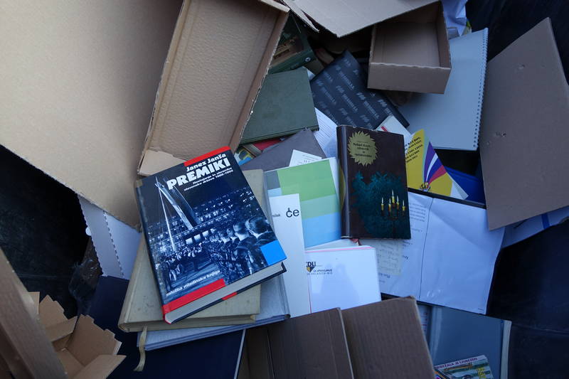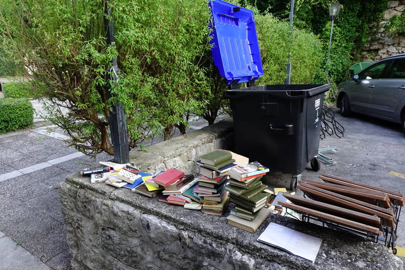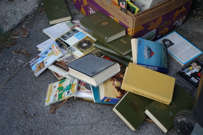 V zabojnik za odpadni papir, ki se nahaja pri Kavarni Veronika je neznanec, domnevamo, da gre za načitanega prebivalca ene izmed okoliških mestnih hiš, odvrgel pravo malo družinsko knjižnico.