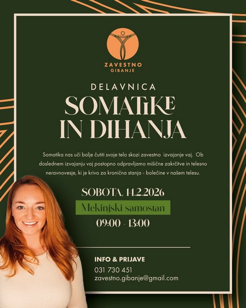 Vabljeni na 4-urno delavnico, na kateri boste spoznali osnove SOMATIKE, izvajalka Neža Grkman, dipl. fizioterapevtka pa vas bo vodila skozi več somatskih in dihalnih vaj.