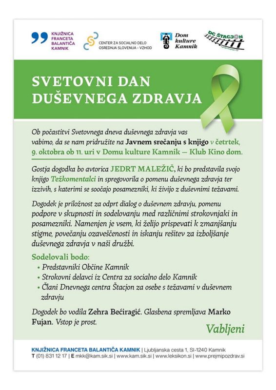 Ob počastitvi Svetovnega dneva duševnega zdravja vas vabimo, da se nam pridružite na Javnem srečanju s knjigo v četrtek, 9. oktobra ob 11. uri v Domu kulture Kamnik – Klub Kino dom.