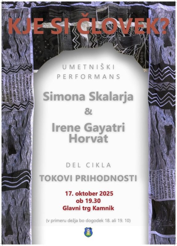 Vabljeni na umetniški performans KJE SI ČLOVEK? Simona Skalarja in Irene Gayatri Horvat v petek, 17. oktobra 2025, ob 19:30 na Glavnem trgu v Kamniku. »Kje si človek« je del cikla »Tokovi prihodnosti«, umetniških performansov, avdiovizualnih