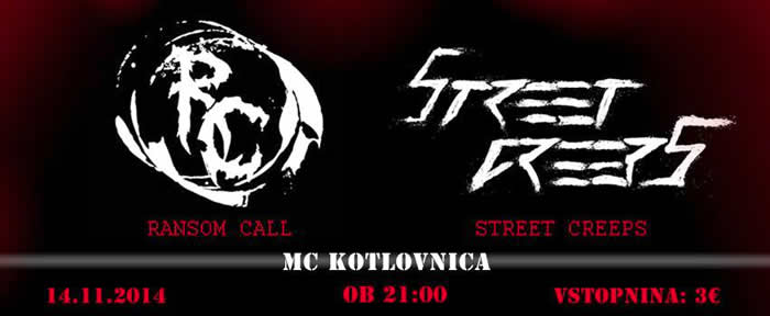 V petek, 14. novembra 2014, se v Kotlovnici obeta večer umazanega rocka s skupinama Ransom Call in Street Creeps.