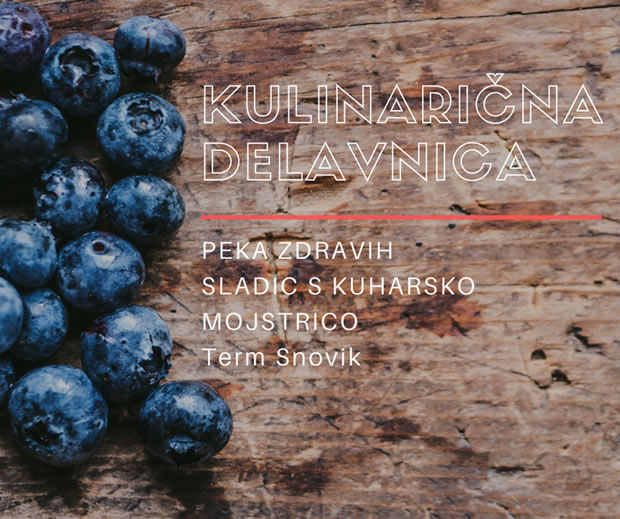 Sladice so lahko tudi zdrave. S kuharsko mojstrico restavracije Potočka bomo pekli same slastne, a brezgrešne sladice: Borovničev zavitek Ajdova kaša s suhim sadjem Pirine palačinke Prijava na recepciji Term Snovik do 9:00 na