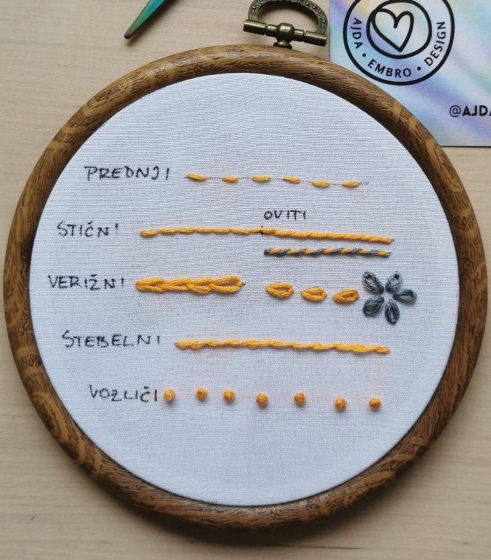 Na delavnici se boste naučili: prednji vbod, stični vbod, oviti stični vbod, verižni vbod, vozličke, stebelni vbod, leno marjetko. Če bo čas, bomo raziskali tudi dodatne vbode.