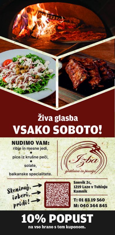 Vljudno vabljeni na ponovno odprtje gostilnice in pizzerije Izba v Snoviku, ki bo, razen z okusno in raznovrstno ponudbo, popestreno tudi z živo glasbo.