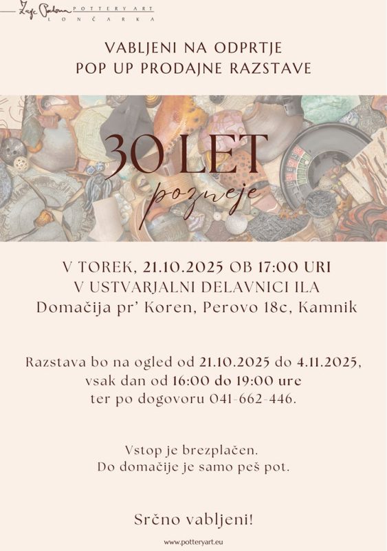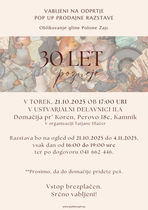 Vabljeni na odprtje pop up prodajne razstave “30 let pozneje, oblikovanje gline Polone Zajc”, ki bo v torek, 21. oktobra 2025, ob 17. uri v ILA v ILA dotik ustvarjalnosti na domačiji pr’Koren, Perovo 18c, Kamnik.