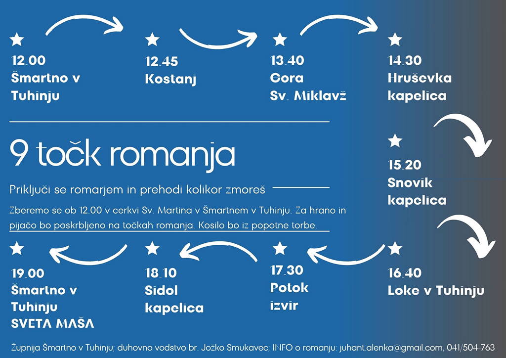 Kraj: Cerkev sv. Martina – Šmartno v Tuhinju ob 12.uri ali kasneje kjerkoli na trasi romanja