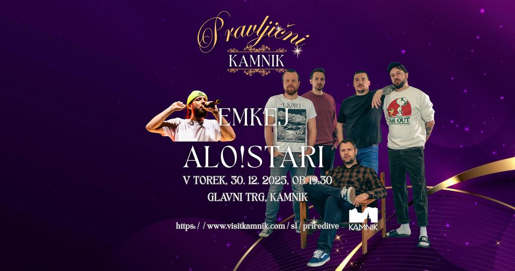 V torek, 30. decembra bo mlado kamniško občinstvo na Glavnem trgu dinamično prebudila punk zasedba predskupine Alo!Stari in legenda slovenskega repa Emkej, ki s svojimi besedili še vedno ostaja prizemljen, realen in duhovit.