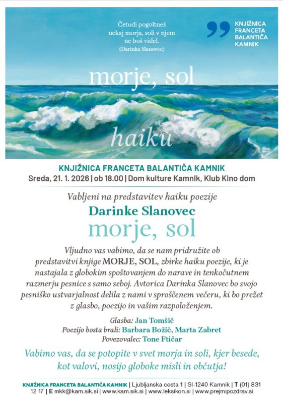 Vljudno vas vabimo, da se nam pridružite ob predstavitvi knjige MORJE, SOL, zbirke haiku poezije, ki je nastajala z globokim spoštovanjem do narave in tenkočutnem razmerju pesnice s samo seboj. Avtorica