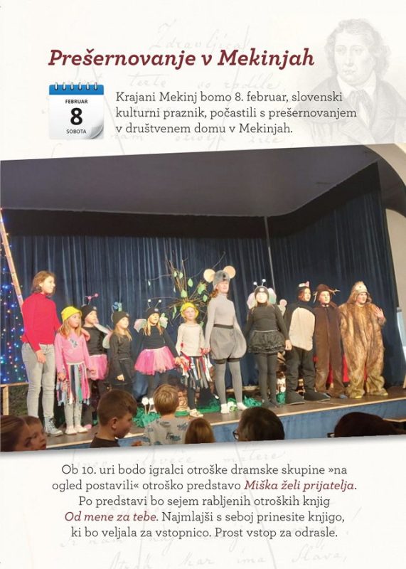 Krajani Mekinj bomo 8. februar, slovenski kulturni praznik, počastili s prešernovanjem v Društvenem domu v Mekinjah. Ob 10. uri bodo igralci otroške dramske skupine »na ogled postavili« otroško predstavo Miška želi