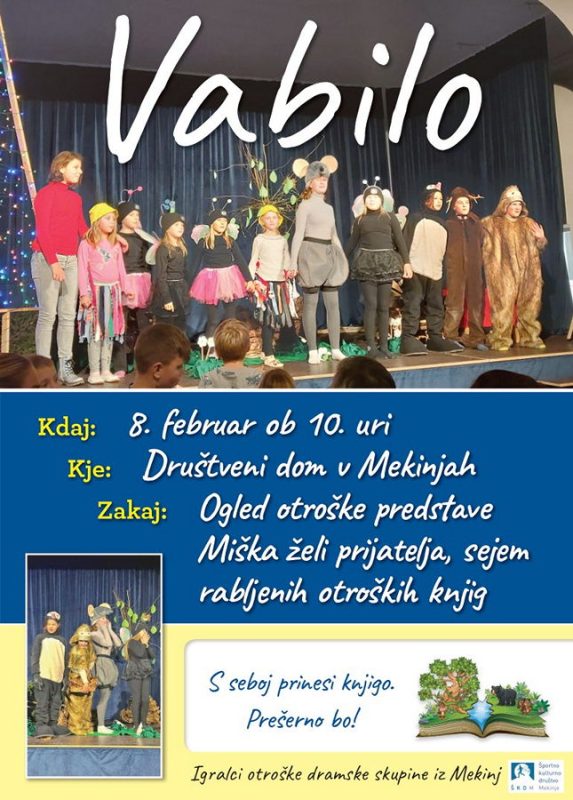 Ob 10. uri bodo igralci otroške dramske skupine »na ogled postavili« otroško predstavo Miška želi prijatelja. Po predstavi bo sejem rabljenih otroških knjig Od mene za tebe.