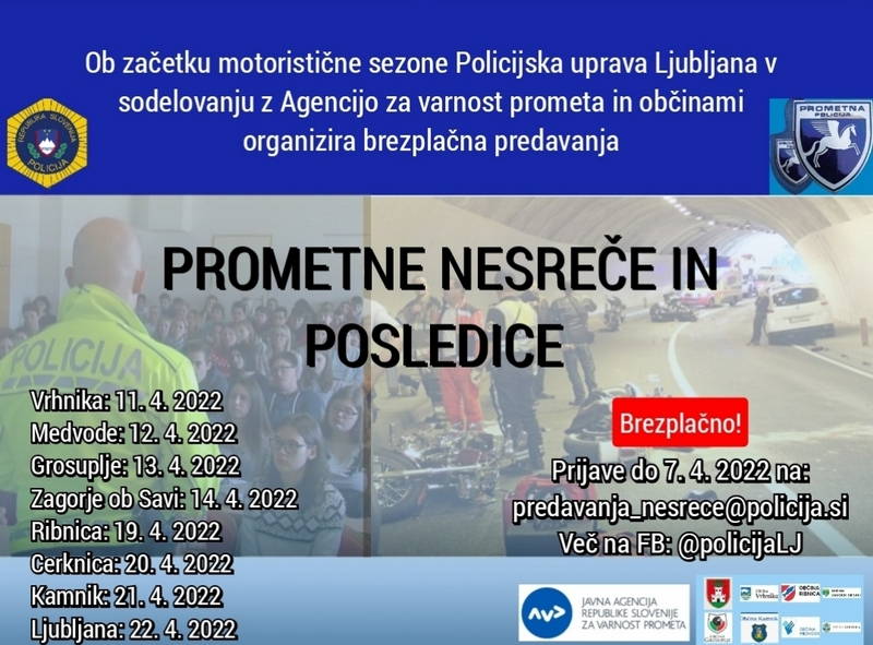Policijska uprava Ljubljana pred začetkom motoristične sezone, v sodelovanju z Javno agencijo RS za varnost prometa (AVP) in občinami, organizira predavanja, ki so namenjena predvsem uporabnikom enoslednih motornih vozil, mladim voznikom in tudi ostalim udeležencem v prometu. Predavanje je namenjeno predvsem ozaveščanju o posledicah prometnih nesreč in posledično s tem krepitvi zavedanja, kako pomembno je naše ravnanje v prometu.