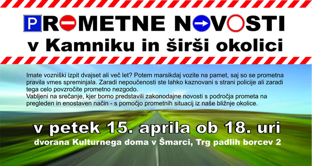Ker se v tem času spreminja tudi prometna zakonodaja, ki vpeljuje nova pravila, smo se odločili in v sodelovanju s KS Šmarca prirejamo dogodek z naslovom PROMETNE NOVOSTI V KAMNIKU IN ŠIRŠI OKOLICI.