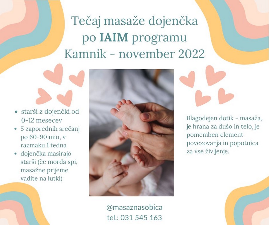Nadina masažna sobica vas vljudno vabi na tečaj masaže dojenčkov po IAIM, ki se bo začel v četrtek, 17. novembra 2022, ob 10.30 v Domu kulture Kamnik.