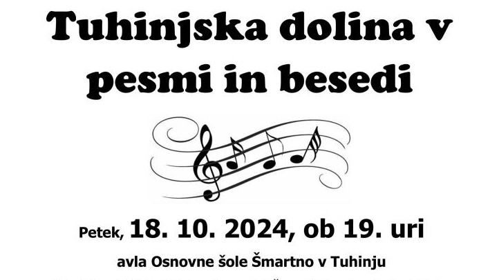 Mešani pevski zbor Mavrica vas vabi na prireditev Tuhinjska dolina v pesmi in besedi, ki bo v petek, 18. 10. 2024, ob 19. uri v avli Osnovne šole Šmartno v