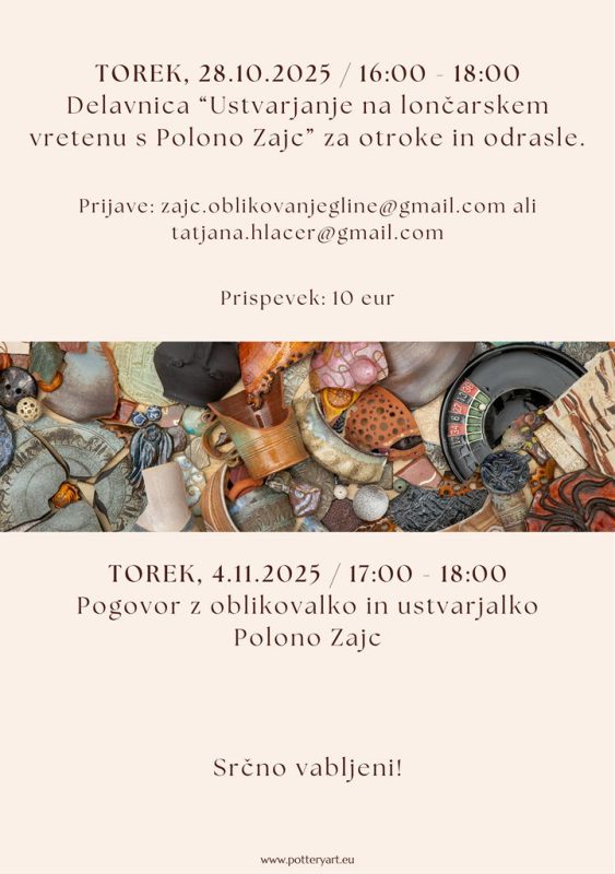 Vljudno vabljeni na delavnico ustvarjanja na lončarskem vretenu za otroke in odrasle s Polono Zajc, ki bo v torek, 28. oktobra 2025, med 16.in 18. uro potekala na domačiji Pr’