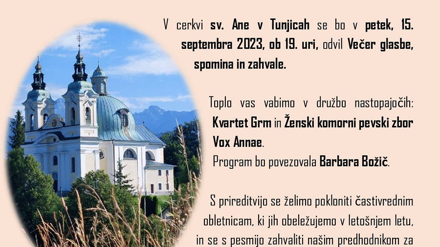 V cerkvi sv. Ane v Tunjicah se bo v petek, 15.septembra 2023, ob 19. uri, odvil Večer glasbe, spomina in zahvale. Toplo vas vabimo v družbo nastopajočih: Kvartet Grm in Ženski komorni