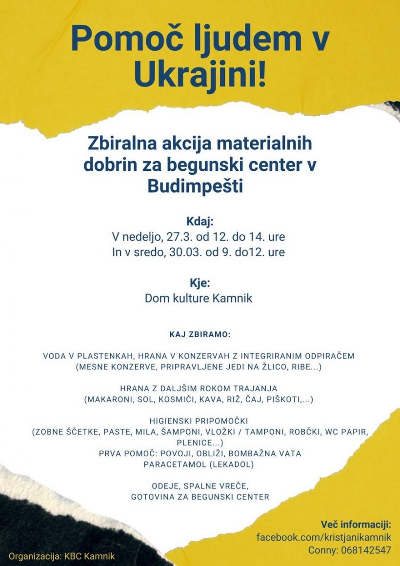 Krščanska baptistična cerkev Kamnik v sredo, 30. 3.2022, od 9. do 12. ure v Domu kulture Kamnik organizira zbiralno akcijo materialne pomoči za begunski center v Budimpešti.
