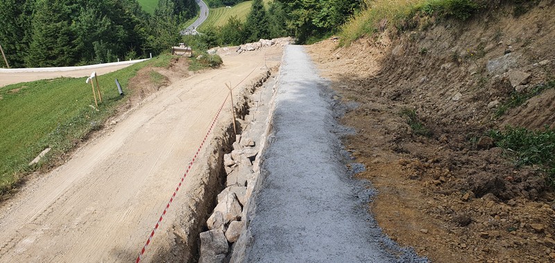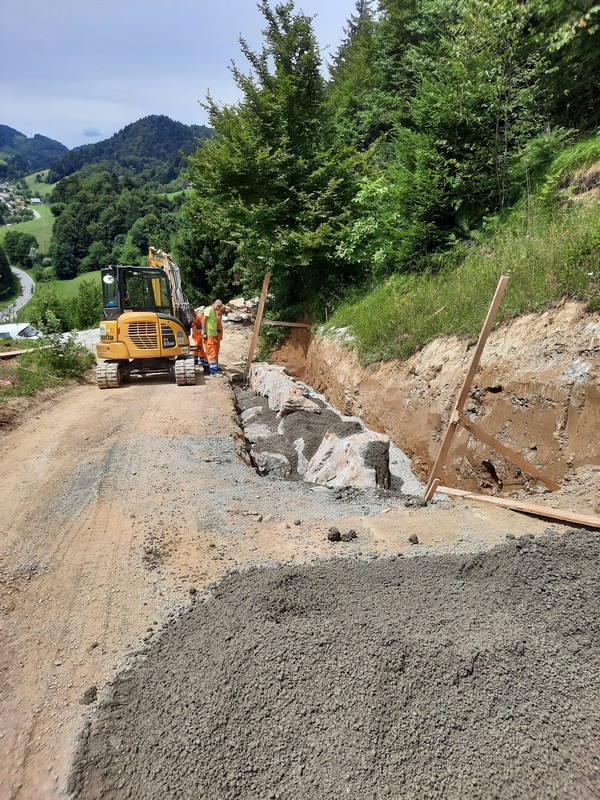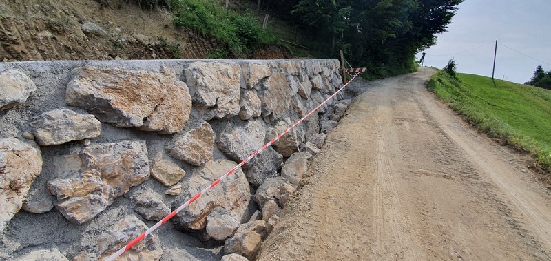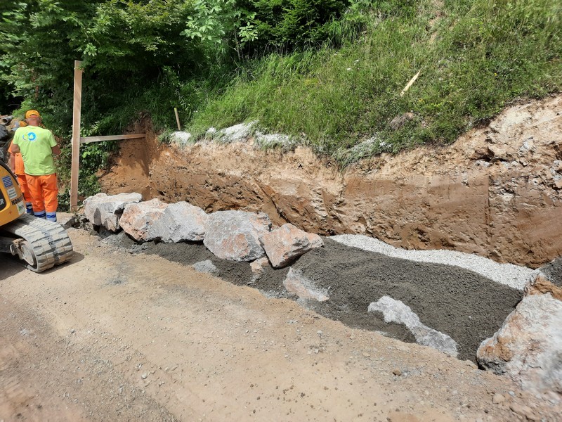 Z izgradnjo večjega usada nadaljujemo na območju Doline – Špitalič. Gradimo zadnjo kampado opornega zidu globine 3,5 oz. dolžine 13 m. Dela, ki bodo trajala še dober teden dni, bodo zaključena z dograditvijo in utrditvijo obstoječe ceste.