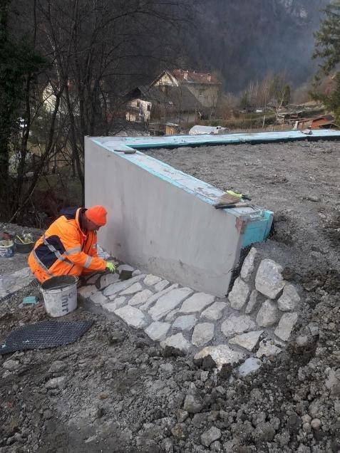 Zelo dobro napredujejo tudi rekonstrukcijska dela na vodohranu v Črni pri Kamniku, kjer se je v preteklem tednu nadaljevalo z izgradnjo betonirane kamnite zložbe, fasade in polaganjem hidroizolacije ter tudi keramike v samem objektu, že kmalu pa bo urejena tudi okolica samega vodohrana, ki bo iz sanitarnih oz. varnostnih razlogov ograjen z žično ograjo.