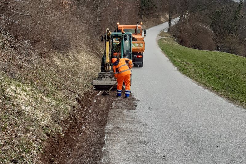- Krpanje udarnih jam na makadamskih cestah: Žaga, Rožično, Volčji Potok