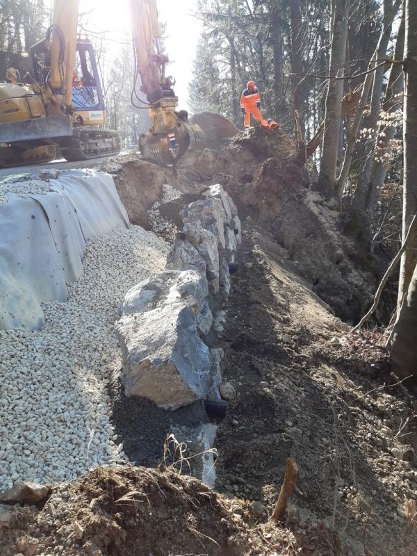 Še naprej se trudimo in saniramo posledice plazenja in posedanja cest. Kot smo napovedali, smo se v tem tednu lotili sanacije dveh usadov, in sicer v Malem Rakitovcu, kjer je bil v tednu dni postavljen 10 m podporni zid, tako da se bo lahko ekipa že v ponedeljek posvetila še ureditvi ceste, na kateri bodo izvedena še vsa potrebna dela za sanacijo. Za začetek bo, zaradi menjave tampona, potrebna odstranitev starega asfalta.