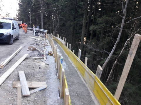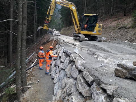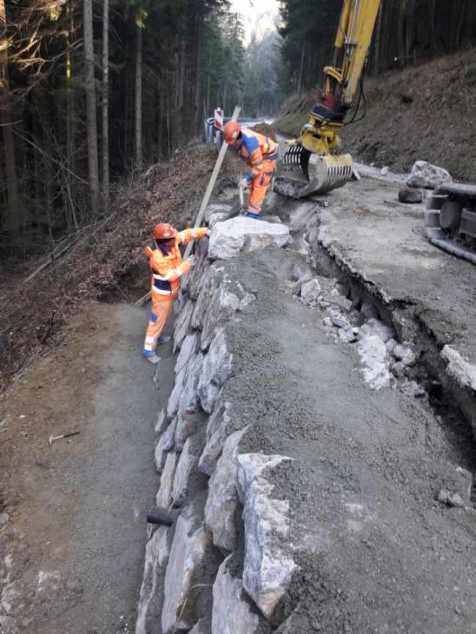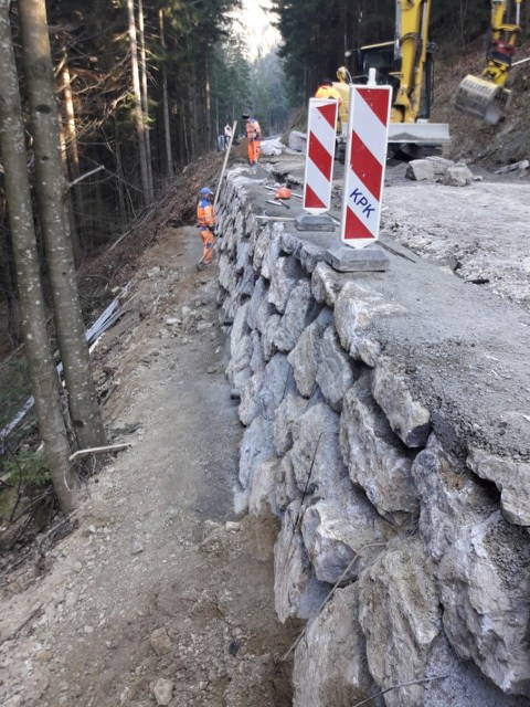 Gradbišče na Kranjskem Raku je v sklepni fazi. Trije kamniti oporni zidovi že stojijo, izvesti pa je potrebno še opažanje in betoniranje vencev. Predpriprave na zadnjo fazo pa so tudi že v teku, stari asfalt je bil odstranjen, v prihodnjem tednu pa se bo, s finimi asfalterskimi deli, delo zaključilo.