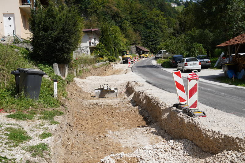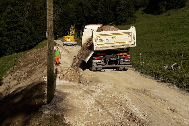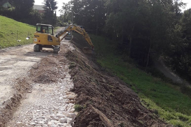 Prva kamnita zložba že stoji. V tem tednu je ekipa nadaljevala z nasipanjem zgornjega dela ceste (okoli 120 m). Sledi izvedba 2. opornega zidu (30 m), ki je predvidena za prihodnji teden.