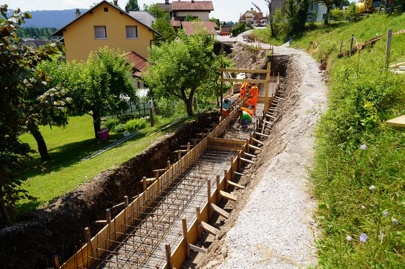 Dela se nadaljujejo tudi v Zgornjih Stranjah, kjer je bil v preteklem tednu že narejen temelj opornega zidu, ki bo cesto varoval pred posedanjem, pod cesto ležeče hiše pa pred plazenjem.