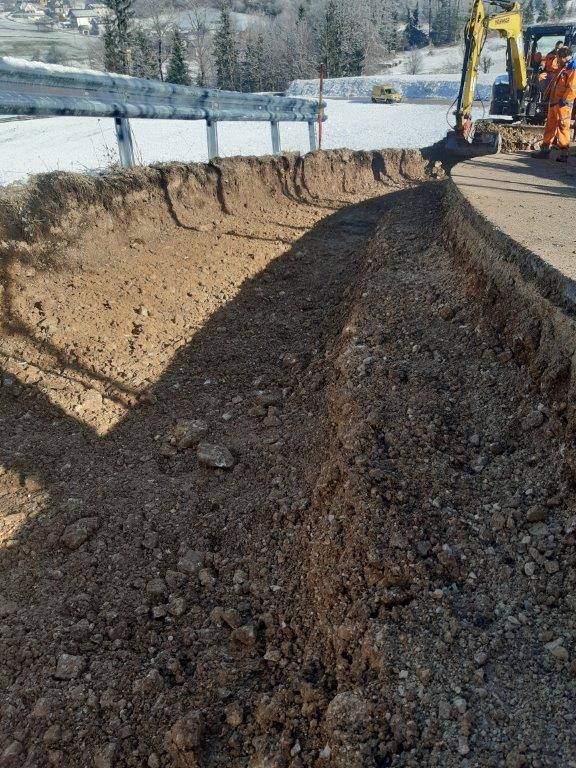 Zaradi posedanja oz. plazenja terena je mestoma precej načeta tudi cesta, ki vodi proti Velikemu hribu, zato je bila v preteklem tednu že izvedena raziskava terena s sondiranjem, začela pa so se tudi že sama sanacijska dela.