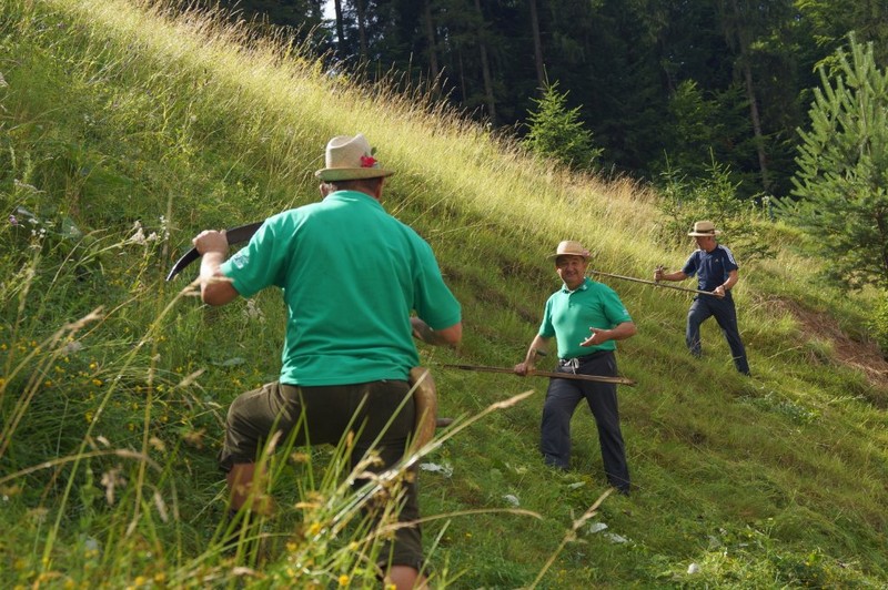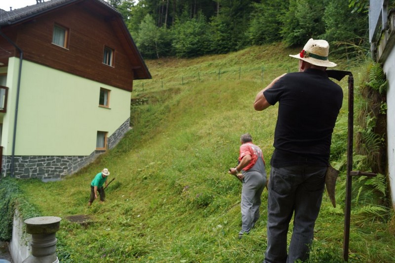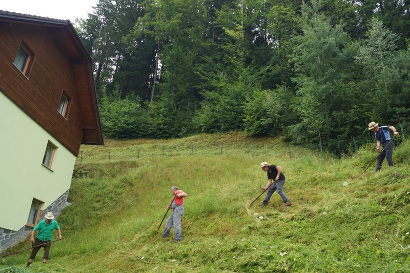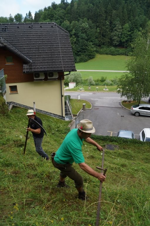 Apartmajski gostje so z zanimanjem opazovali in spremljali letošnjo košnjo koscev s skrbno sklepanimi, ostrimi kosami.