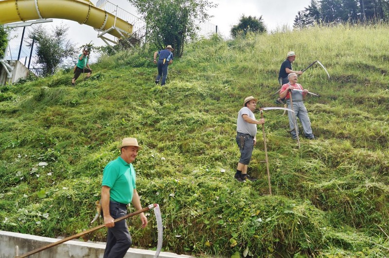 V apartmajskem naselju Term Snovik so člani Turističnega društva Tuhinjska dolina s predsednikom Ivanom Hribarjem v soboto, 1. julija, pripravili prikaz košnje po starem.