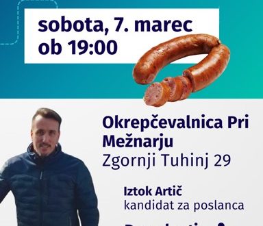 Vabljeni v soboto, 7. 3. 2026, ob 19.00 v Okrepčevalnico pri Mežnarju, Zgornji Tuhinj 29, kjer boste imeli priložnost osebno spoznati Iztoka Artiča, kandidata za poslanca stranke Demokrati Anžeta Logarja.