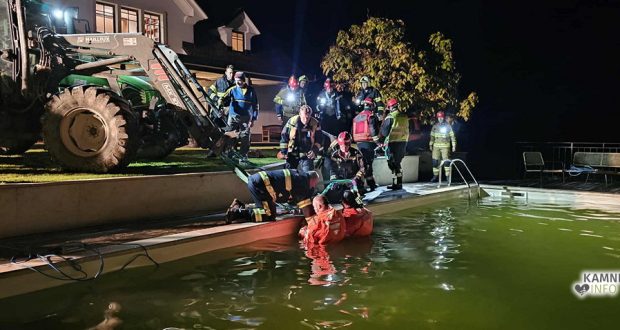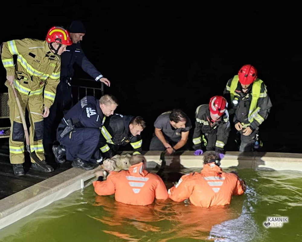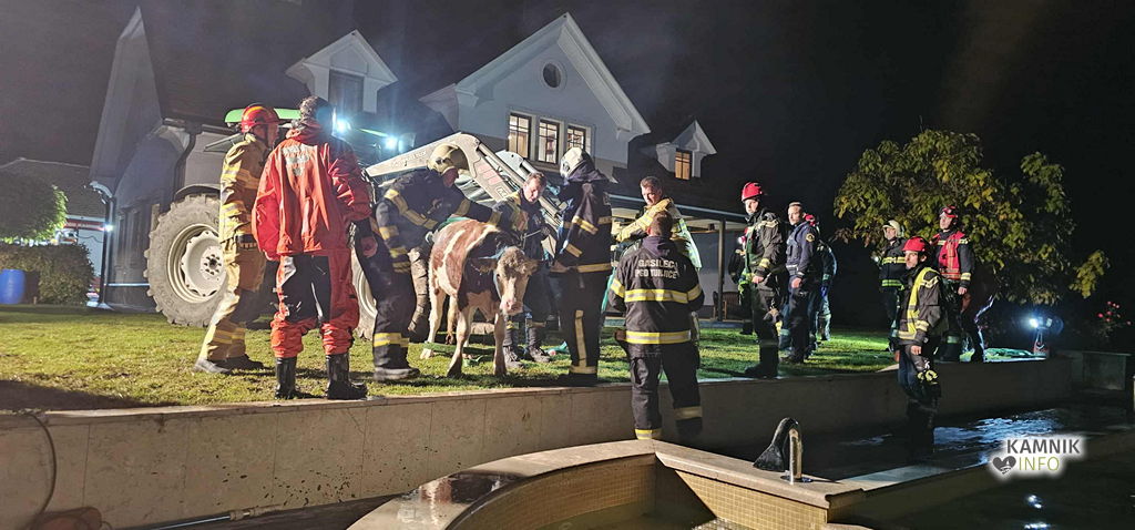 Kravi, ki si je privoščila nočno kopanje so na pomoč priskočili gasilci PGD Kamnik in PGD Tunjice ter jo, z nemalo truda in ob pomoči traktorja, nepoškodovano dvignili iz bazena in pospremili nazaj v zavetje hleva.