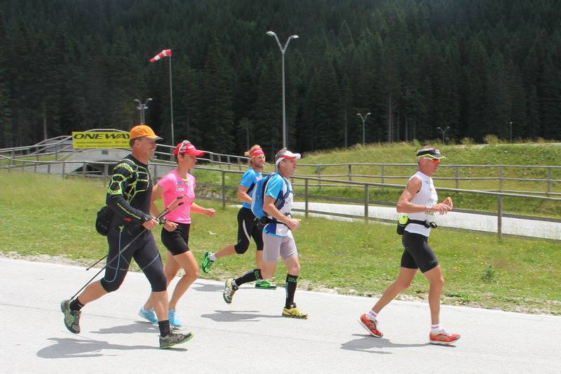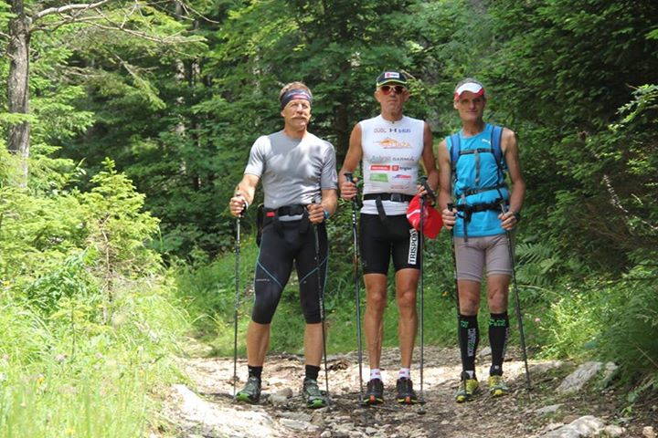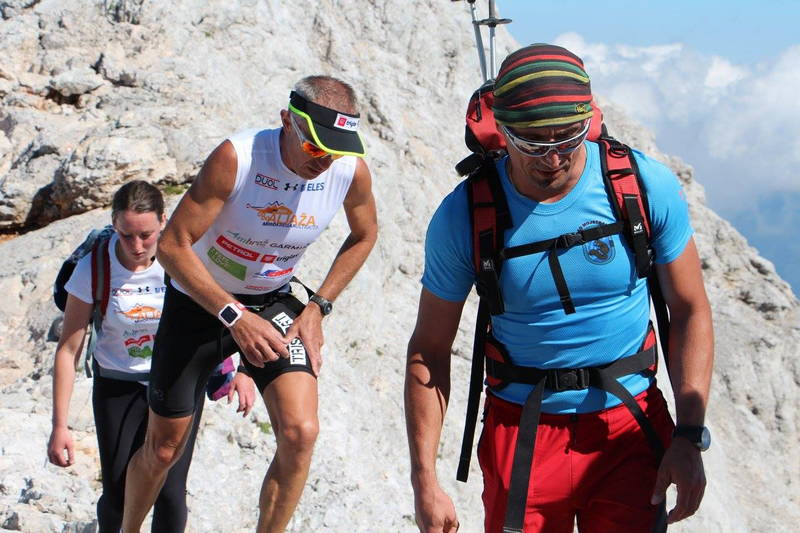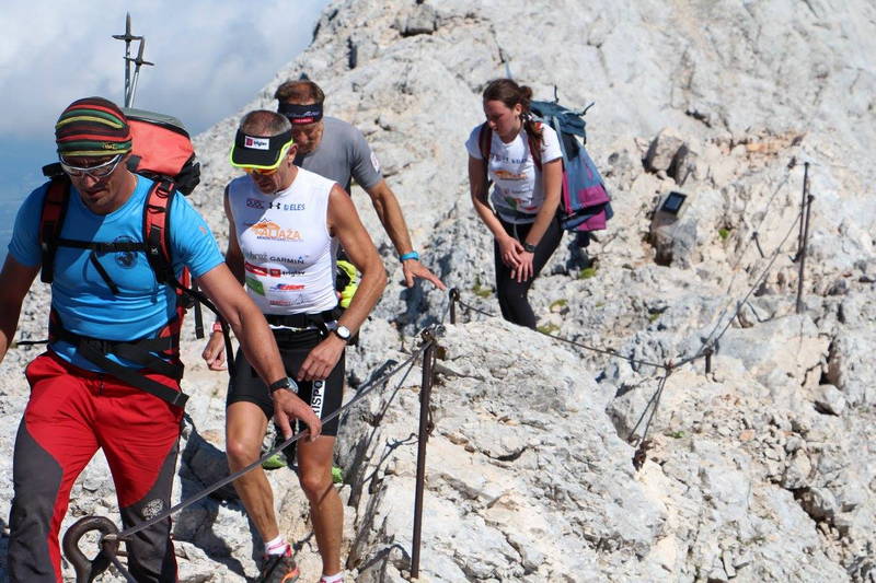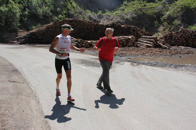 Najtežji del je bila tretja četrtina, tek na Pokljuko. Po pretečenem maratonu noge niso več pretirano sveže, sonce je nažigalo direktno v hrbet in klanci tja gor niso prav nič položni. Hitrost drastično pade, skoraj za polovico in to traja kar 2 uri in pol, kar je precej utrujajoče za psiho. Ko postaneš utrujen, se ti tudi piti in jesti ne da več, tako da se moraš v to kar prisiliti, drugače gredo zadeve rapidno navzdol. Ob meni je bil Tof s stalno polnimi rokami gelov in napitkov, Mira mi je za sproti nabirala pokljuške divje jagode. Liza, Meta, Drejc in Katja so bili razporejeni po poti do Vodnika s svežimi zalogami banan in nektarin, na Planiki me je čakala Neža, kjer sem se zadnjič okrepčal za finalni naskok na vrh. Energetska bilanca je pri takih zadevah odločilnega pomena, bolje je bili vseskozi malo v plusu, ko enkrat zaideš v deficit, se težko pobereš. To je dosti lažje, če imaš ob sebi ljudi, ki te enostavno prisilijo, da ješ in piješ. Samo da srečaš človeka, ki ti ploska in navija ob poti, te kar ponese, kaj šele domačega, z energetskim napitkom v roki. Vodo sem zgoraj pil kar iz gorskih studencev. Prijetno osvežujoča je bila. Dušan mi je vsake toliko časa odtrgal zelišče, ki je kar odprlo dihalne poti, da sem lažje dihal.”