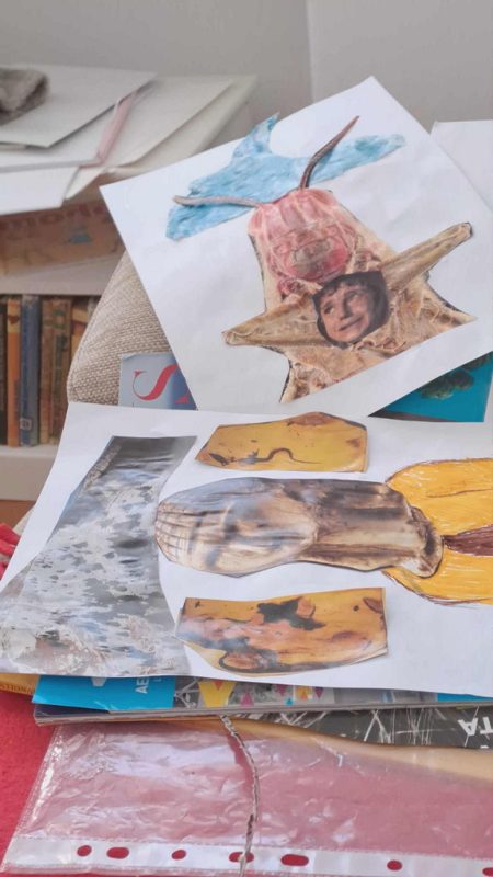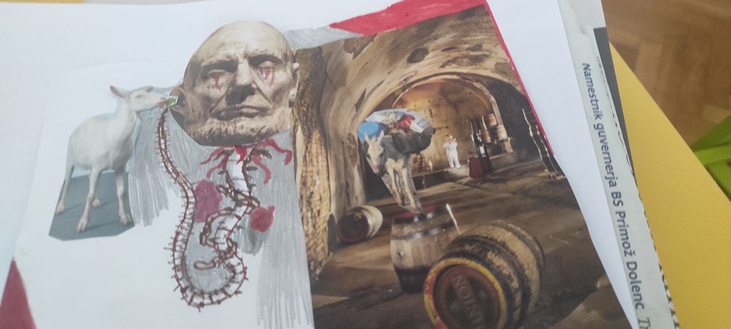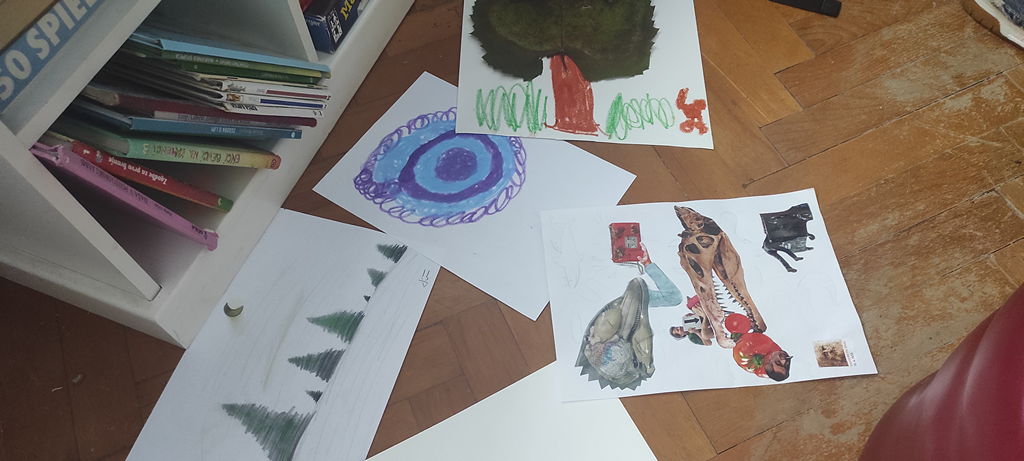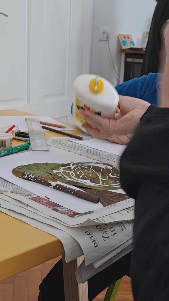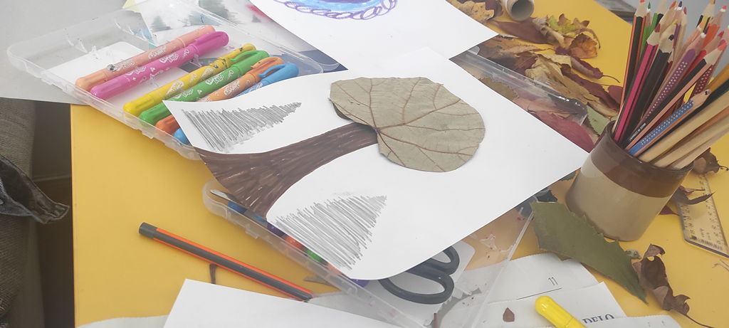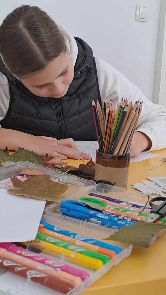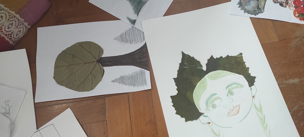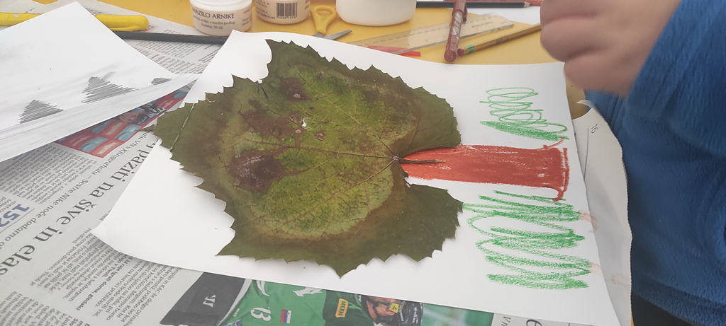 Na voljo so nam bili različni materiali, od kolaž papirja, starih revij, časopisov, ki se ga je lepo pokombiniralo s flomastri, barvnimi svinčniki, še lepše pa se je na belih risalnih listih na posteljico iz mekola poleglo kar zunaj nabrano jesensko listje, prej skrbno posušeno in pripravljeno za ustvarjalniško »steljo«.