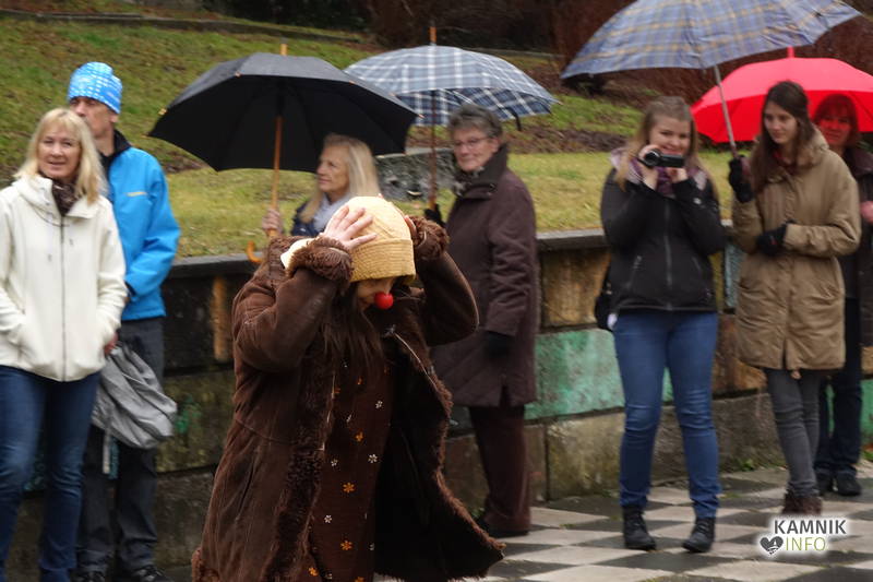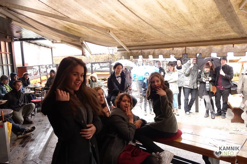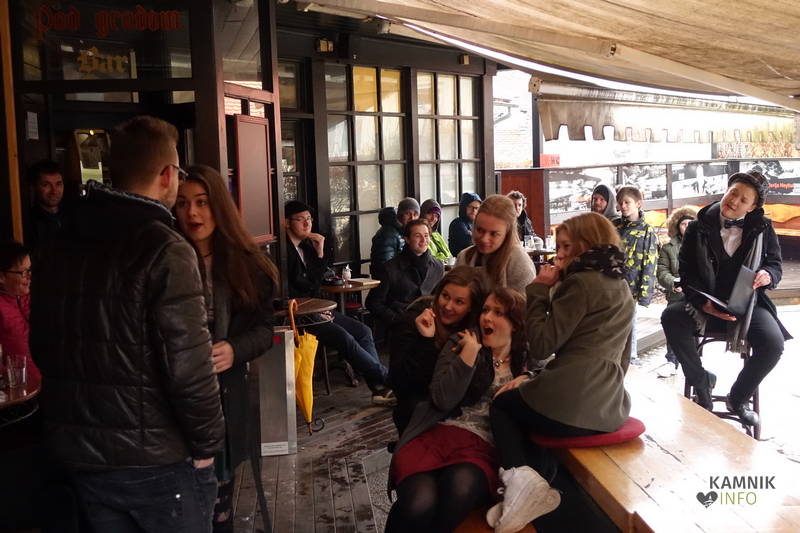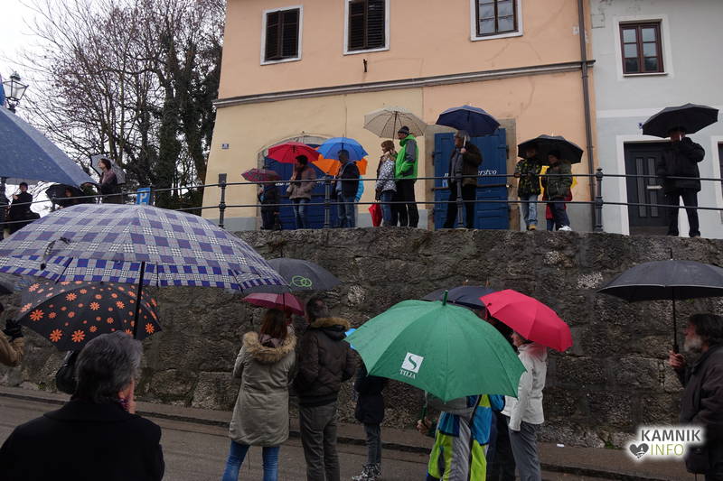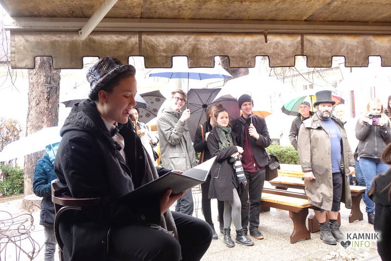 Zatorej se ne gre čuditi, da se je, ko so mestni zvonovi, ki znajo s svojim potrkavanjem, razen napovedovanja približno točnega časa in oznanjanja smrti, brezobzirno zmotiti tudi kako večerno in na prosto pripuščeno kamniško prireditev, oznanili poldne, pod Malim gradom in dežniki zbrala manjša množica, radovednega in morebitnega škandala veselečega se občinstva, dasiravno je bila javnost o dogodku, domala tik pred zdajci, obveščena zgolj prek novodobnih spletnih medijev, četudi je v Kamniku v navadi, da se na prireditve spodobnejšega značaja vabi s tiskanimi vabili, ki pridejo po pošti in, za razliko od oglasnih letakov s kitajskimi izdelki, neprebrana končajo med starim papirjem, ter prek Kamniškega občana oz. Kamničan-ke, kajti prej omenjeno glasilo z več kot pol stoletno tradicijo je bilo, v 54. letu starosti, usmrčeno z odtegnitvijo občinske finančne infuzije, ki se zdaj steka v smer gorenjske prestolnice.