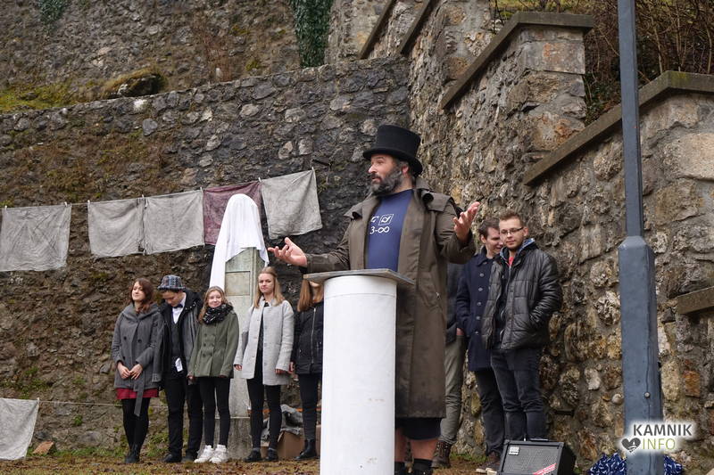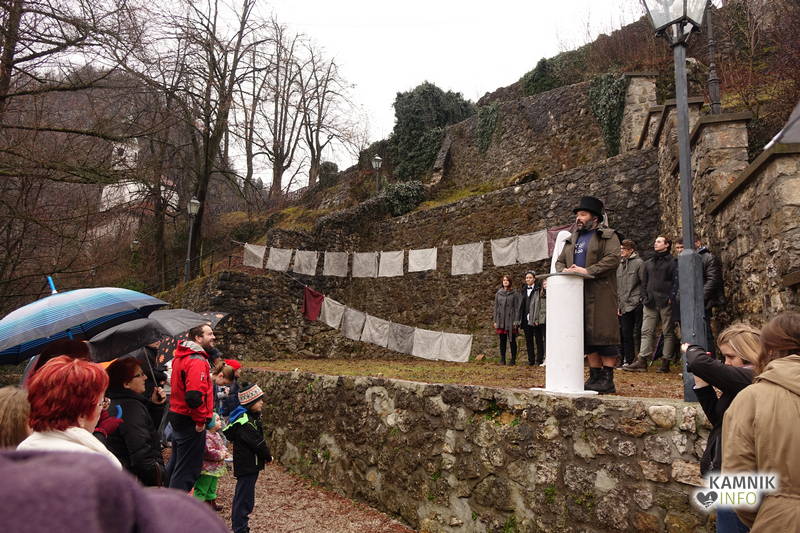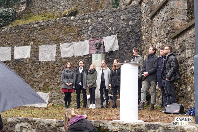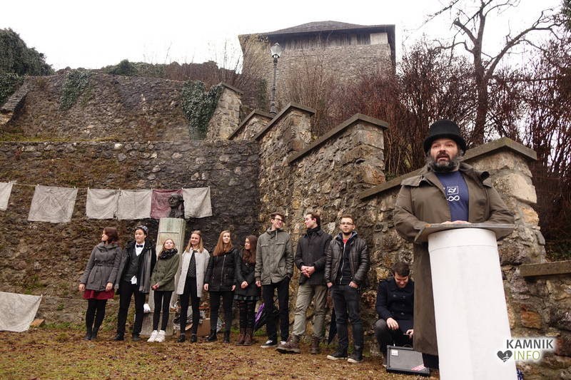 Po kratkem sopihanju na pobočje Malega gradu, k sreči je zima prizanesljiva s snegom, kajti tja gor komunalna lopata le redko zaide, se je ob pokritem spomeniku, kot večer poprej v Domu kulture, razvrstil priložnostni mladinski pevski zbor. Ob tem se je nemudoma razjasnilo, da izobešene umazane cunje niso zgolj navadne cote, ampak cunje, ki so jih nekdaj uporabljali v propadli smodnišnici. Njihova nadaljnja usoda je podobna usodi ostale kamniške industrijske dediščine, ki jo božajo zgolj še roke bagerjev in podobne gradbene mehanizacije, eksponati kamniškega muzeja industrijske dediščine, katerega obeti so vse manj obetavni, pa bodo bržčas ohranjeni v katerem izmed potopljenih rudniških jarkov nekdanjega rudnika v Črni, ali morda celo v Motniku, če so delavci ob zapiranju v njem morda pozabili kak kos orodja in opreme, ki bo, četudi nekoliko težje dostopna, počakala na zgodovine željne zanamce.
