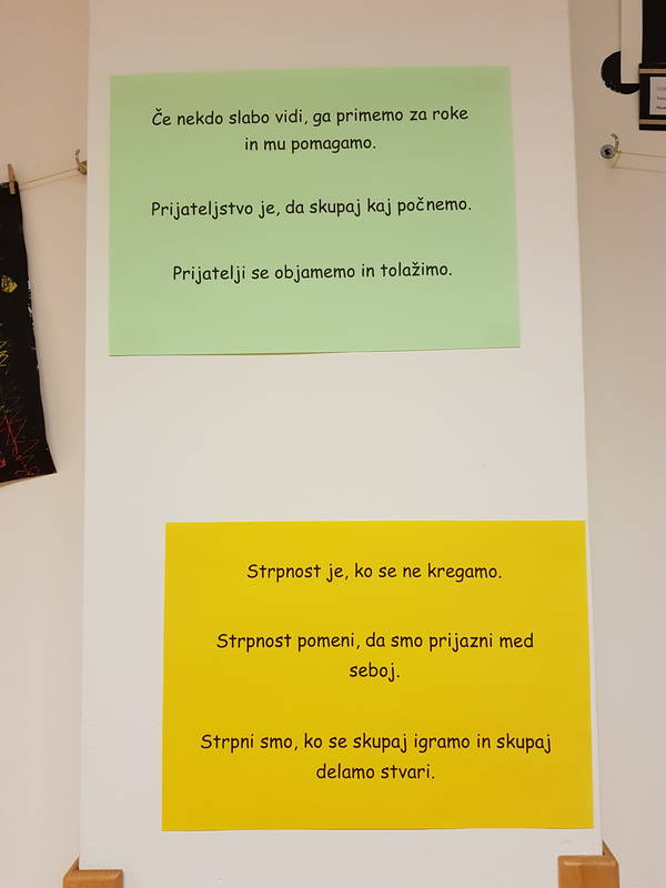 Z otroki druge starostne skupine smo sodelovale pri človekoljubnem projektu Mednarodni dan strpnosti – dan za strpnost in prijateljstvo. Poleg vseh dejavnosti, ki jih vsakodnevno izvajamo z otroki, smo se v tednu mednarodnega dneva strpnosti (12. 11. – 16. 11. 2018) posvetili projektu z naslovom Stop obrekovanju. Vzgojiteljice smo izvedle izobraževalno-ustvarjalno delavnico na podlagi pravljice Dogodek v Mestnem logu (Helena Koncut Kraljič). Skupaj z otroki smo prepevali pesmi o prijateljstvu, se igrali socialne igre, se pogovarjali o prijateljstvu in strpnosti ter tudi o obrekovanju. Veliko smo se družili z ostalimi skupinami v vrtcu ter spodbujali strpnost. Vse svoje vtise so otroci nato strnili na papir. Ustvarjali smo v različnih tehnikah in upodobili, kaj otrokom pomeni prijateljstvo.