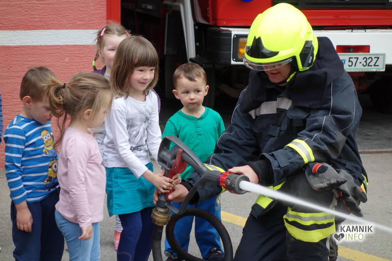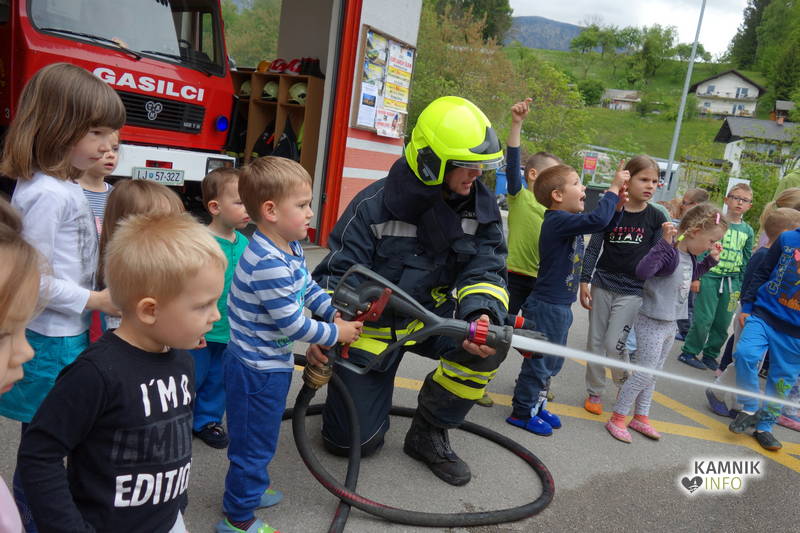 Ob kamniških vrtcih je te dni moč opaziti gasilska vozila in male gasilce, ki veselo zalivajo okolico vrtcev.