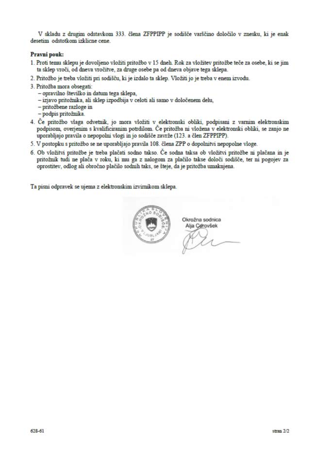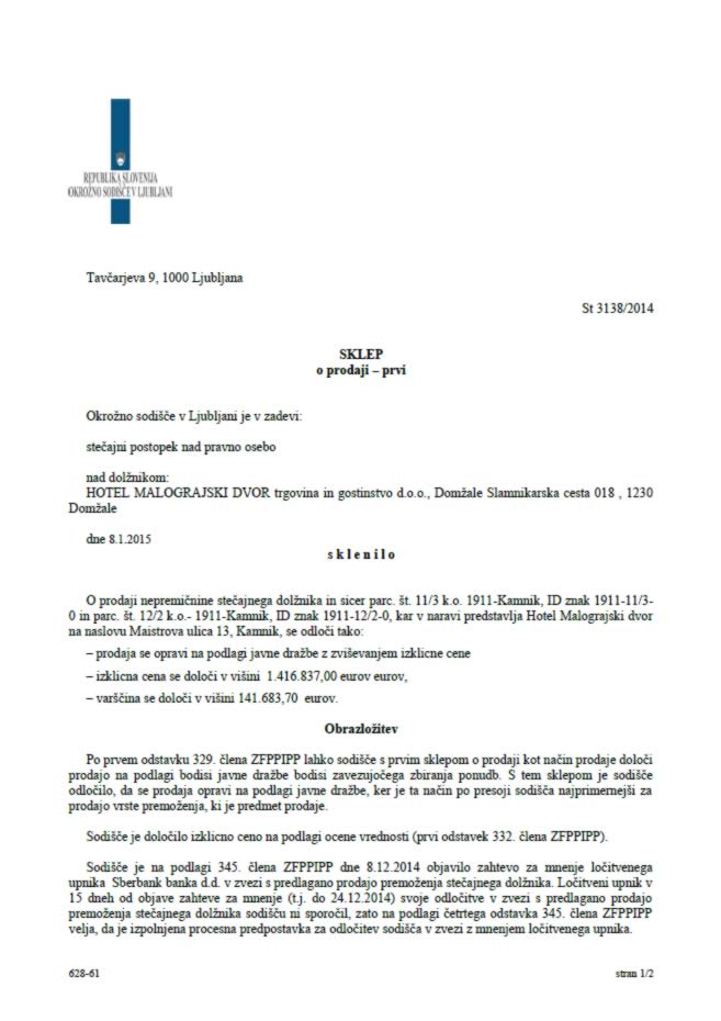 Okrožno sodišče v Ljubljani je, 8. januarja 2015, že izdalo sklep o prodaji hotela Malograjski dvor. Hotel, ki zaenkrat obratuje le v dopoldanskih urah, je pred časom vzela v najem družba Porta Ilirica d.o.o., ki je najbrž tudi najresnejši interesent za nakup hotela, katerega izklicna cena bo na prvi dražbi znašala skoraj milijon in pol evrov.
