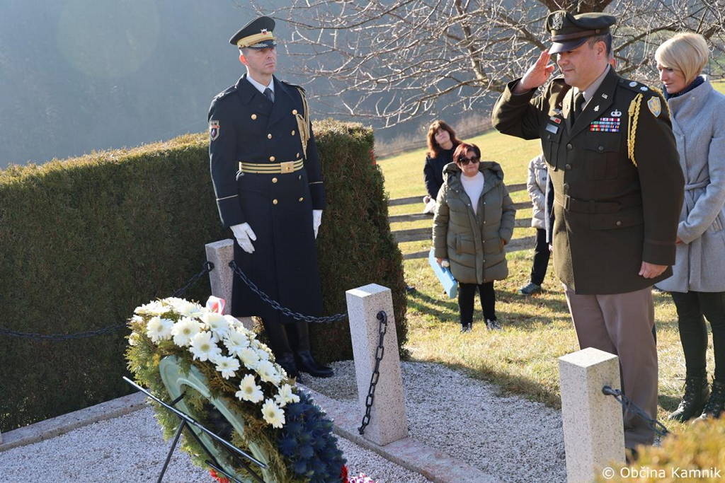 V imenu Občine Kamnik je prisotne nagovorila podžupanja Romana Učakar: »Spoštovane gostje, spoštovani gostu, spoštovani minister za obrambo gospod Marjan Šarec, cenjeni predstavniki Veleposlaništva ZDA, občinske svetnice in svetniki, predsednik Združenja borcev za vrednote NOB Kamnik gospod Igor Kanižar ter ostali predstavniki veteranskih in domoljubnih organizacij, lepo pozdravljeni v imenu Občine Kamnik. Ob tej priložnosti se že na začetku iskreno zahvaljujem vsem, ki vsako leto na tem mestu spomina in opomina izražate spoštovanje in hvaležnost ter se ob slovesnosti poklonite pogumu, ki so jo izkazali naši junaki med drugo svetovno vojno. A ne le slovenska kri, tudi ameriška kri je bila prelita, saj so naši domovini služili naši zavezniki. Predanost in neustrašnost sta tisti lastnosti, ki so nas, zanamce bork in borcev druge svetovne vojne, zavezali k temu, da spoštujemo polpreteklo zgodovino in še toliko bolj cenimo svobodo, ki so nam jo predniki pridobili s trdim bojem. Včeraj smo ob državnem prazniku, dnevu samostojnosti in enotnosti poudarjali pomen slovenske države in pomen enotnosti. Občutek ponosa in spoštovanja naše domovine je prisoten še danes, kajti zgodovina samostojnosti in enotnosti naše države odraža odločnost in pogum naših prednikov vseh vojn za Slovenijo. Ohranjali smo enotnost med ljudmi in z odločnostjo ter pogumom izpolnili dolgoletno željo našega naroda-željo po samostojni in neodvisni državi. Hvala vsem, ki so se priborili našo samostojno sedanjost in naj nam da pogum borcev za svobodno Slovenijo navdih, da skupaj gradimo razumevanje, spoštovanje in povezanost v letu 2024. Srečno in vse dobro v imenu župana Mateja Slaparja, v imenu Občine Kamnik in v mojem lastnem imenu.«