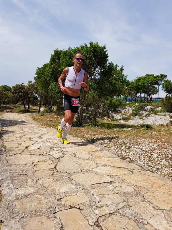 Štart plavanja ob 10.uri je sicer spremljalo še nekaj oblakov, ki pa so se kmalu razkadili v sončen dan. Plavanje ni bilo stresno, saj se nas je 200 moških tekmovalcev hitro razporedilo v čistem morju, ob koncu pa sem spet imel nekaj težav z prebolelim vestibularnim sindromom in izgubo ravnotežja, saj se mi je začelo zadnje metre v vodi vrteti, tako da sem ob izhodu iz morja celo zletel po stopnicah. K sreči so trdna tla naredila svoje in že po prvih metrih kolesarjenja sem se začel počutiti odlično. Proga je peljala iz Petrčanov v Nin, kjer so nas, na zaprti cesti čakali precej ravninski štirje krogi, v katerih mi je uspelo hitrost stopnjevati, tako da sem kolesarskih devetdeset kilometrov končal s povprečno hitrostjo 37,3 km/h. Na žalost pa nas je ravno ob izhodu iz zadnjega kroga, ko se “nabijanju” tekmovalcev skoraj ne da izogniti, dohitel sodnik na motorju in štirim tekmovalcem; Ukrajincu, Hrvatu, meni in Juretu Velepcu, pokazal kazen vožnje v zavetrju – modri karton. Kazni nisem komentiral, sem pa po prihodu v menjalni prostor izgubljal čas, saj sem želel od sodnikov izvedeti kje “se kazen oddela.” Pa v tistem trenutku niso vedeli. Med tekom sem od Helene dobil informacijo, da je moj glavni konkurent Josip Živković pred menoj za dobro minuto in v glavi sem že praračunaval, da me bo kazen najbrž drago stala in bova z Josipom, po vsej verjetnosti, zamenjala lanski mesti. In res, po pretečenem prvem krogu, so me sodniki potegnili v “penalty box,” kjer v času kazni tekmovalec ne sme niti na WC. Kljub temu, da so se mišice ohladili sem tek nadaljeval v svojem tempu in tudi zaradi informacij, ki sem jih od Helene dobival ob progi, zaostanek šestih minut počasi začel zmanjševati. Josipa sem ujel in prehitel v zadnjem krogu in v do konca nabral ugodne tri minute prednosti, ki so pomenile zmago v kategoriji. v krasno jutro, ki je omogočalo optimalne pogoje na progi.