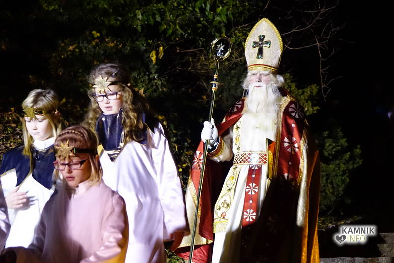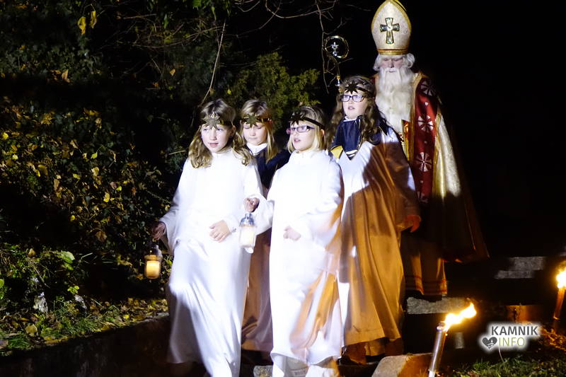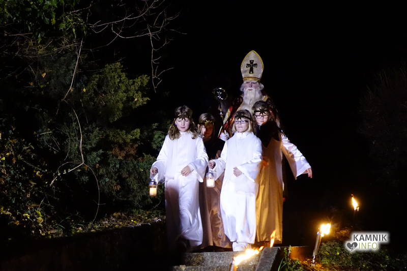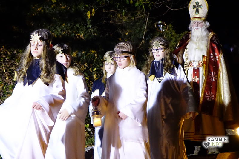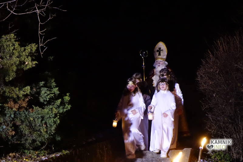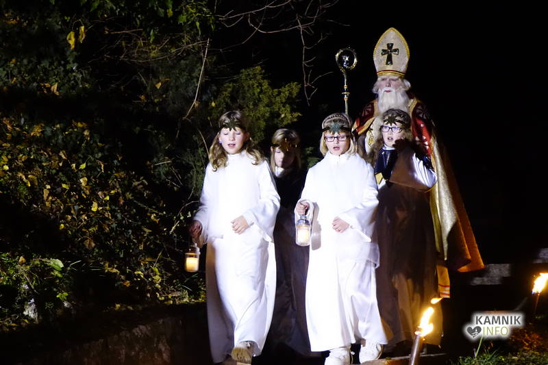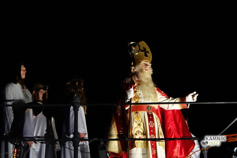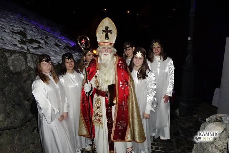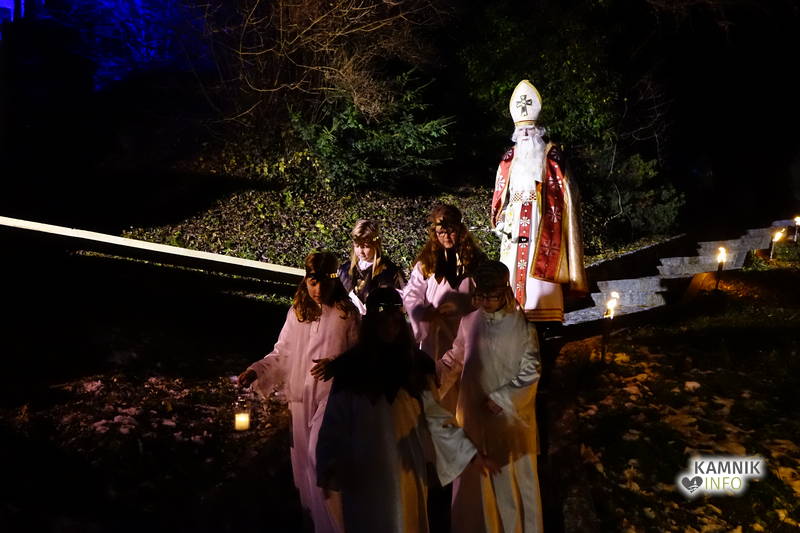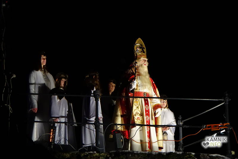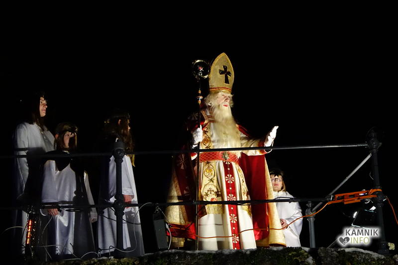 Ko je, vsaj v odigrani igrici, dobro znova zmagalo dobro nad zlim, je z malograjskega pobočja, v spremstvu angelov prišel sv. Miklavž, ki je najprej nagovoril, nato pa se, v siju raket, spustil z Malega gradu in vsaj simbolično tudi obdaroval najbolj pridne kamniške otroke.