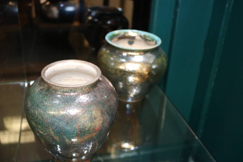 Tokratna razstava je plod dela lončarske mojstrice Mojce Žalik. Njene izdelke, ki imajo obliko arheoloških izkopanin iz časov Emone boste lahko v izložbi občudovali vse do 9. novembra. Predstavlja nam vzhodnjaško tehniko »raku«, ki prihaja k nam z daljne Japonske. »Raku« sicer v prevodu pomeni uživanje in kot pravi Mojca, so posebnost in izziv te tehnike, nepredvidljivi učinki in posebna barvitost. Da pa si jo bomo bolj zapomnili, velja omeniti, da je »raku« način izdelave in žganja gline, ki so ga praviloma uporabljali za izdelavo obrednih čajnih skodelic. Te so na Japonskem ročno oblikovali, še žareče jemali iz peči in hitro ohlajali na zraku. Pri nas, v zahodnem delu tega sveta, so izdelki največkrat oblikovani na vretenu. Pri končni temperaturi žganja so vzeti iz peči in izpostavljeni redukciji z gorljivimi materiali, najpogosteje žaganje, suho listje, papir, konjske ščetine,… Mojca, ki izdelke oblikuje na lončarskem vretenu pravi, da je vedno znova presenečena, ko jih vzame iz peči, saj so vsakič drugačni in torej neponovljivi.