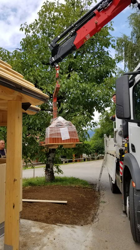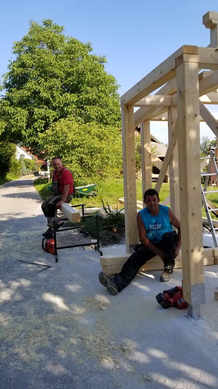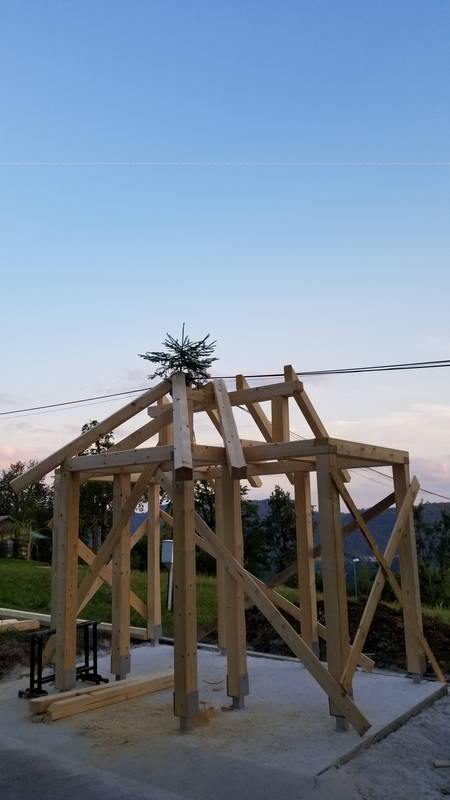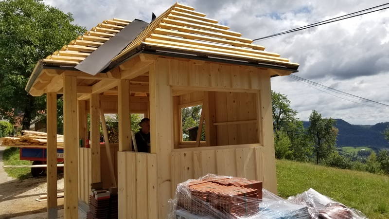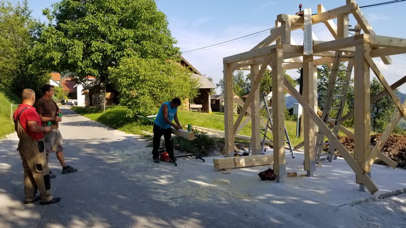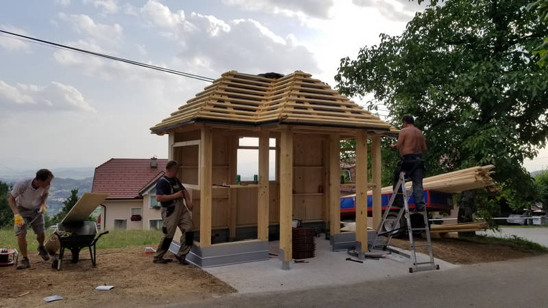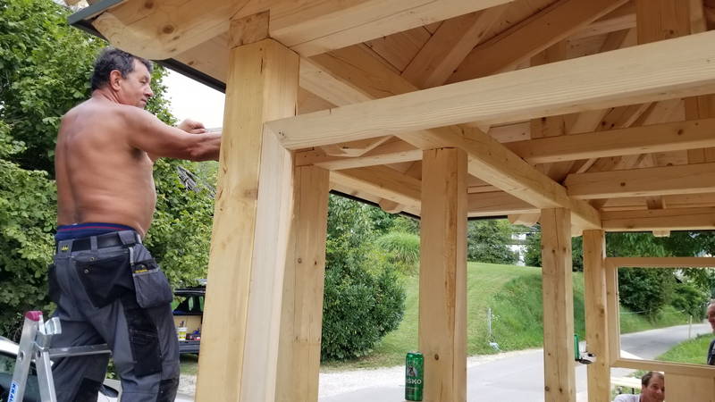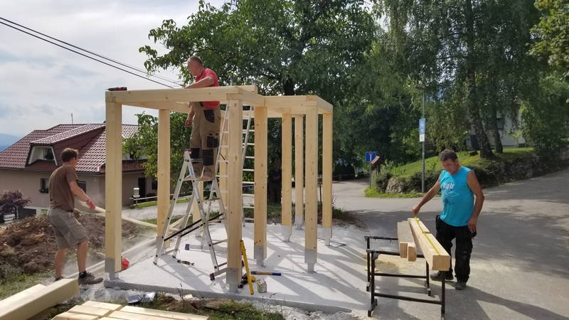 1. avgusta je na označeni lokaciji prvič zabrnel bager Golobovega Mihca, ki je s pomočjo »vaških nadzornikov« opravil izkop. Vanj so Bojan Zvržina, Teo Lužar, Stanko in Mihec Golob ter Miha Starovasnik naslednji dan nasuli pesek in zalili betonsko ploščo. Slednjo je z diamantnim brusilnikom obdelal Uroš Tomec, ki si je čudežno napravo izposodil v svojem podjetju. Šest fantov je tačas v gozdu podrlo izbrana drevesa. Ta je Stanko Golob na žagi primerno obdelal in pripravil vse potrebno za postavitev konstrukcije. Ko je bilo vse nažagano, pooblano in zvezano, so Teo Lužar, Bojan Zvržina in Branko Brežnjak pričeli s postavljanjem hišice. Več kot štirinajst dni so od jutra do večera pridno tesarili in s svojo vztrajnostjo kljubovali žgočemu soncu. Njihovo delo in povezanost je bila navdihujoča in je marsikoga premamila, da se je ustavil na delovišču, se s fanti malo pohecal in nazdravil uspešnemu delu.