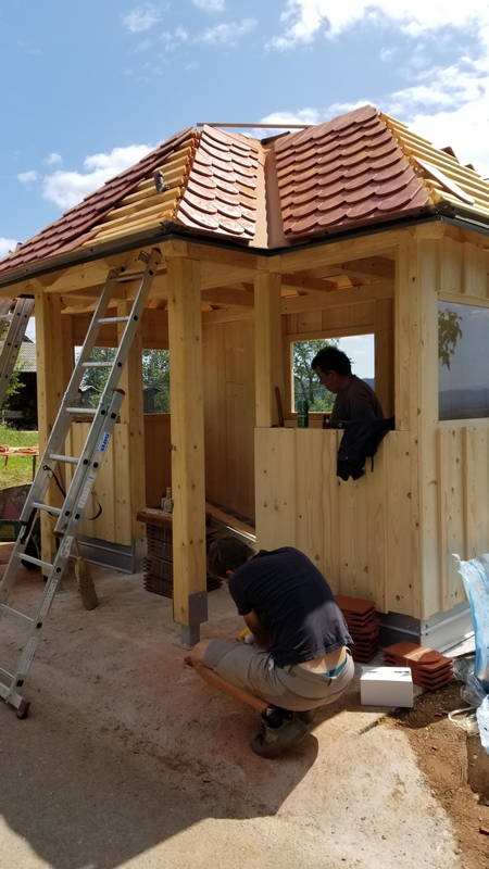 Sredi avgusta se je z bobrovcem že pokrivala streha. Janez Burja je takrat naredil okenske okvirje, v katere je Zdravko Potočnik vpel stekla. Z Bojanom sta v Janezovi delavnici pooblala deske za stene, iz suhega lesa pa je Janez napravil še klopce. Te je bilo potrebno opasati v hišico na železne konzole, za katere je poskrbel Bojan – mojster varjenja.