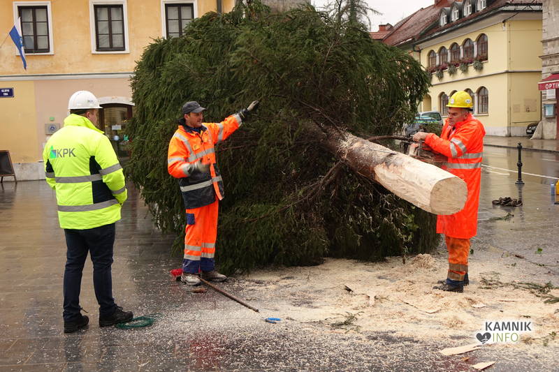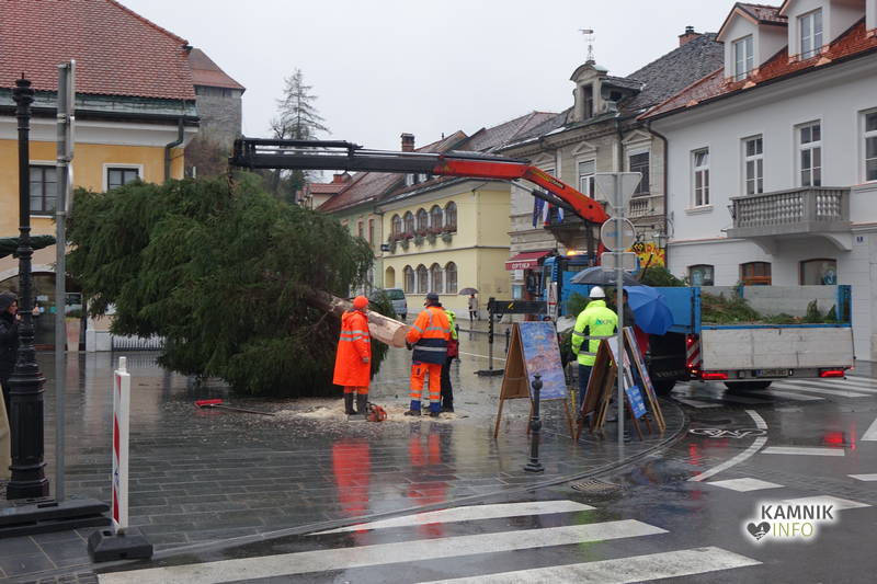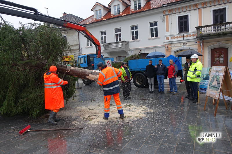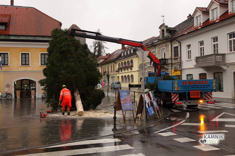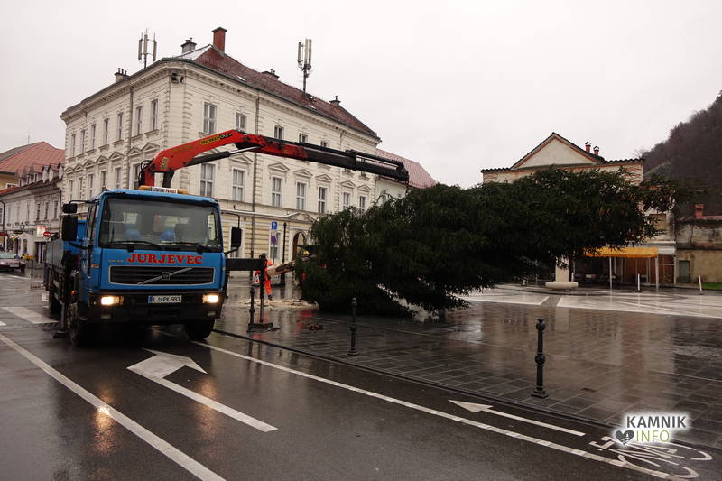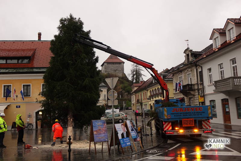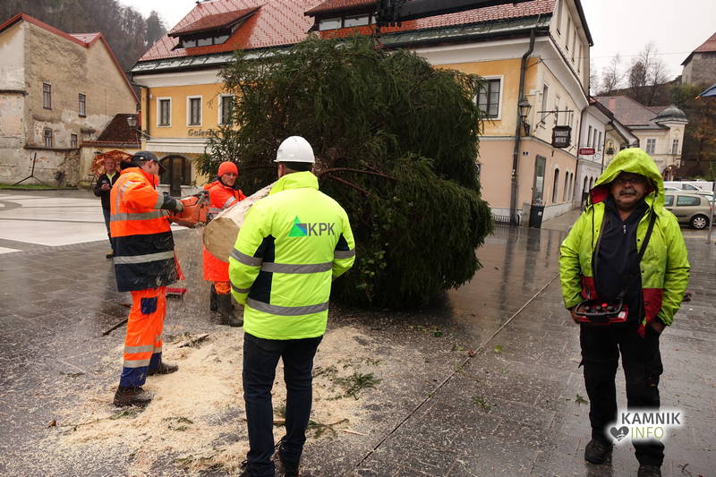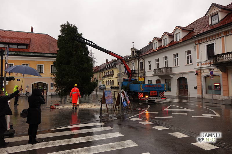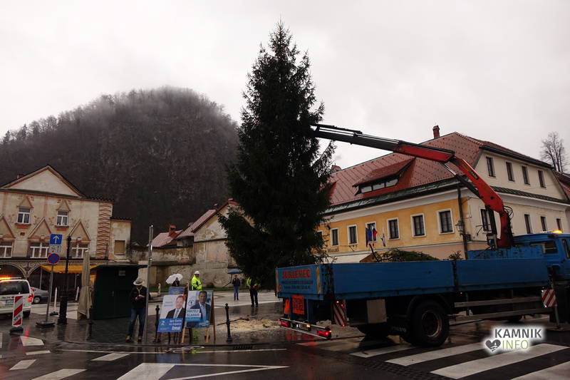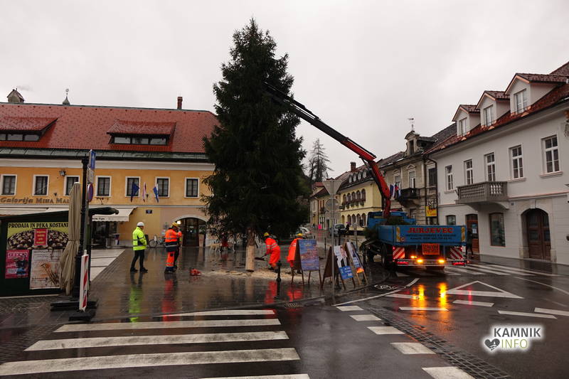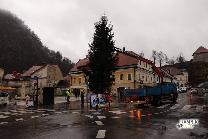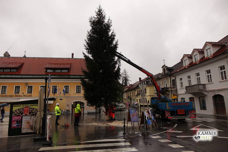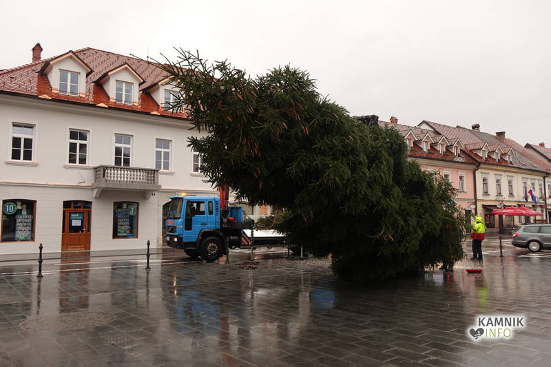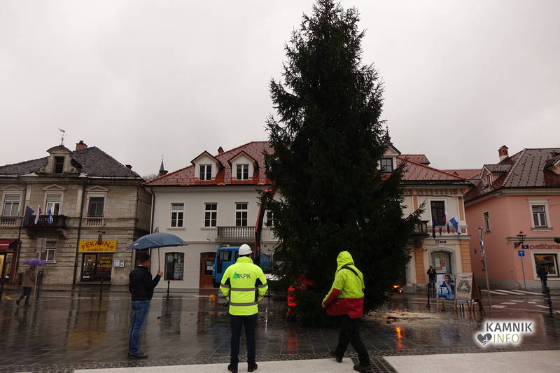 Delavci Komunalnega podjetja Kamnik so danes na prenovljenem Glavnem trgu že pripeljali smreko, ki bo, potem ko bo okrašena in opremljena z lučkami, služila kot osrednje kamniško novoletno drevo.