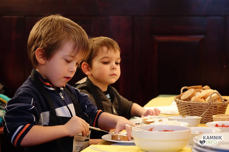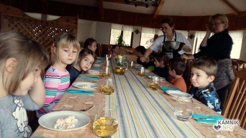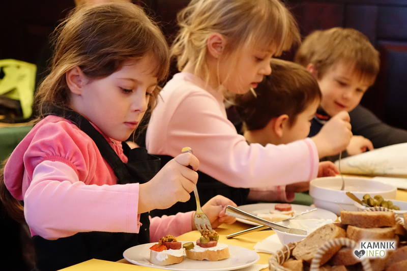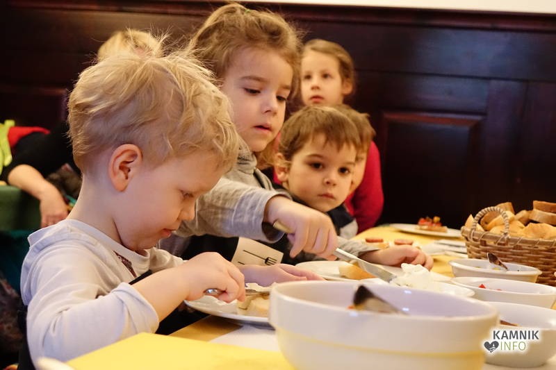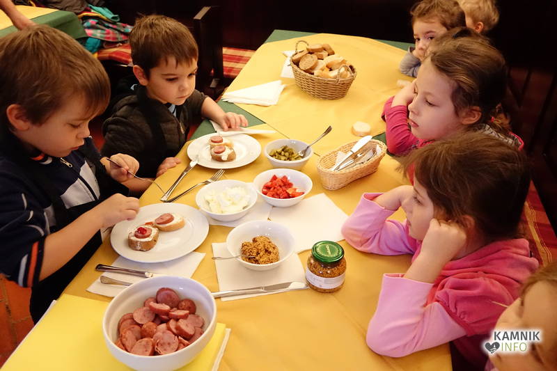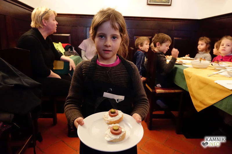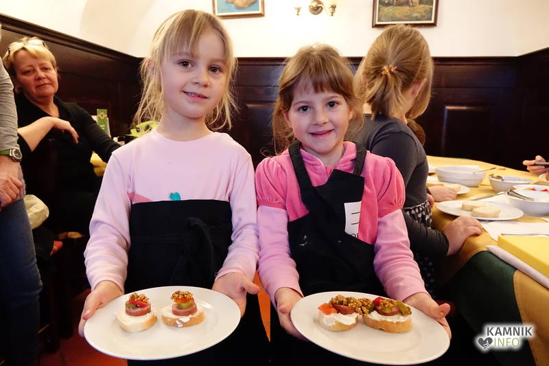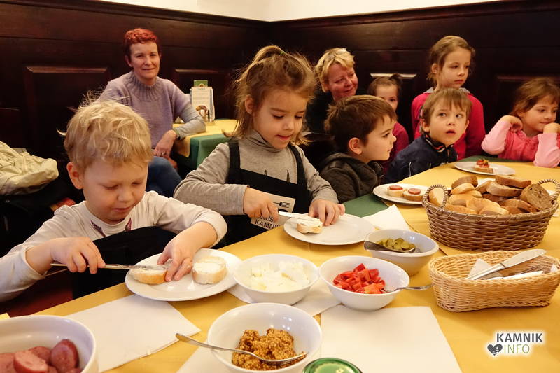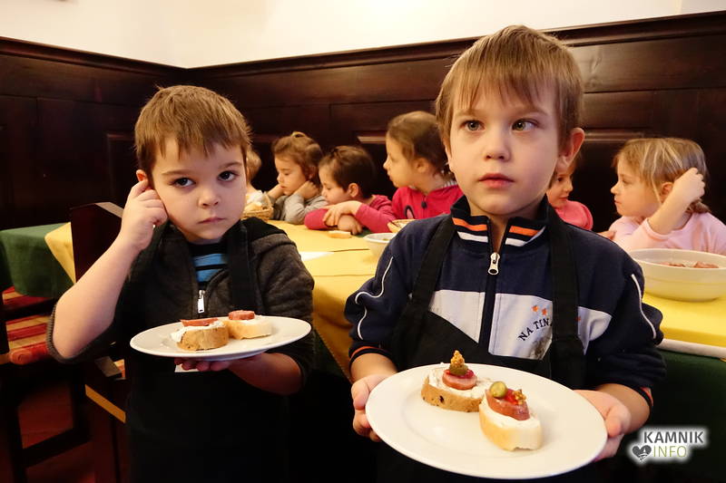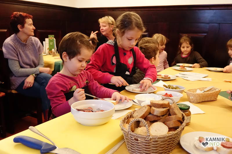 Ob pomoči prijazne tete Irene Dolenc, ki Pri podkvi skrbi za zadovoljstvo svojih gostov, so pripravili obložene kruhke z domačim sirnim namazom, kamniškim ženofom in kamniško kajžarico, izpod njihovih rok pa so prišli prav lični izdelki, ki bi jih bilo moč postreči tudi gostom, ampak tokrat so bili Pri podkvi gostje otroci, zato so obložene kruhke pojedli kar sami.