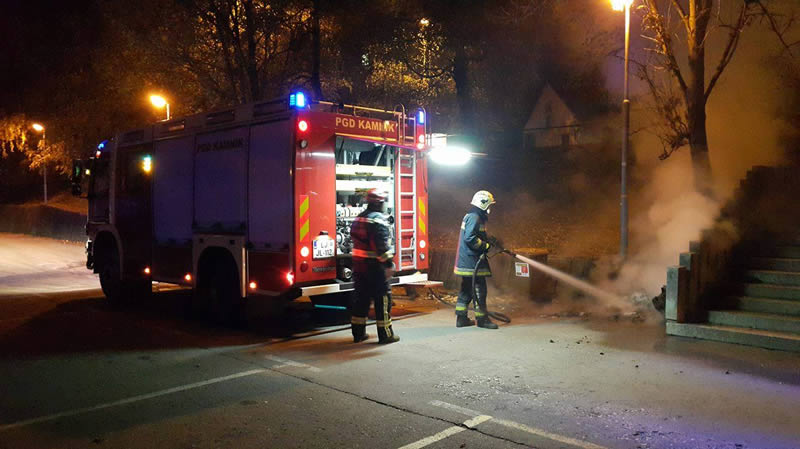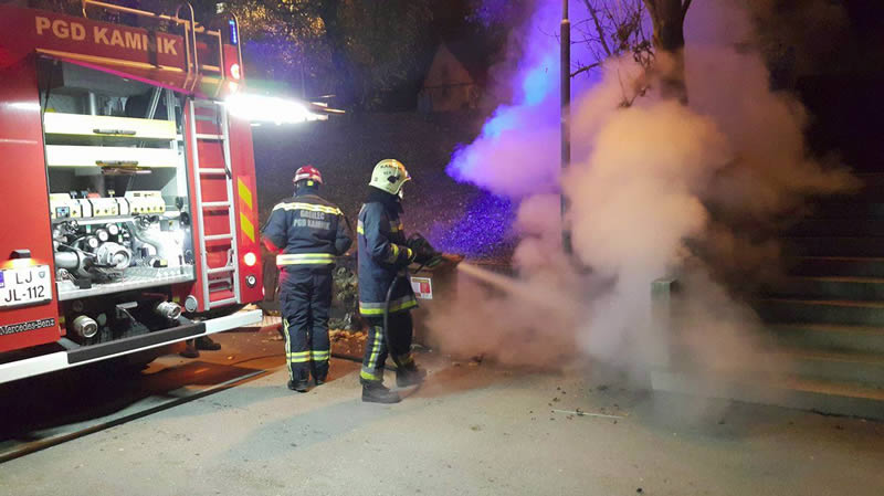 Po uspešno zaključeni intervenciji ob prometni nesreči, pa kamniški gasilci niso uspeli ujeti še kake urice spanja, saj so bili ob 4.54 znova poklicani na pomoč na Ljubljansko cesto, kjer sta ob stopnišču med knjižnico in OŠ Toma Brejca gorela dva plastična zabojnika za komunalne odpadke.